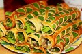 На блинчик кладете лист зеленого салата, а потом любую начинку, например, сыр+грибы+курица+майонез!!!