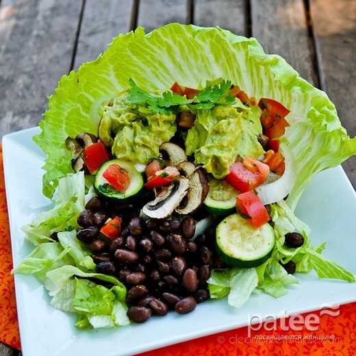 Подрумянь в духовке немного нарезанных цуккини или кабачков, половинку нарезанного красного лука и горсть грибов. Пока овощи готовятся, сделай свою сальсу, салат ведь будет мексиканский: нарежь мелко 2 помидора и четверть стакана кинзы, смешай с половиной стакана нарезанного красного лука, добавь нарезанный мелко авокадо. Фасоль, если она консервированная, промой от соуса, добавь в нее тмин и порошок чили. Все это смешай с горстью измельченного салата айсберг и большим листом латука