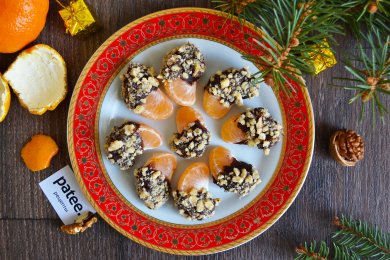 Невероятно простое и вкусное лакомство - мандариновые дольки с шоколадом и грецкими орехами.