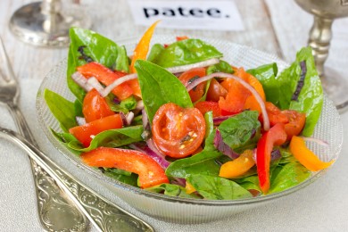 Салат с молоденькими листиками шпината, сочными помидорами черри, сладким перцем- яркий, полезный, содержит много витамин и отлично подойдёт к мясным блюдам в качестве гарнира!