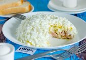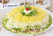 Готовим праздничный слоёный салат с копчёной курицей, картофелем, плавленым сыром и яйцами. Салат Невеста с копчёной курицей и яйцом выглядит весьма скромно и имеет простое оформление - завершающим слоем выступает слой из тёртых яичных белков, что олицетворяет собой белоснежный платье невесты.