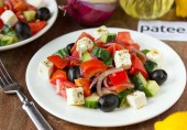 Салат Греческий - традиционный салат греческой кухни, лёгкий, низкокалорийный, так как состоит из овощей в крупной нарезке, кубиков сыра фета и заправки из оливкового масла, соли, перца и орегано.