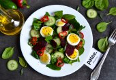 Овощной салат со свеклой, шпинатом и яйцом - очень питательный, вкусный и содержит массу витаминов. Салат получается сытный и насыщенный, но при этом легкий и нежный.