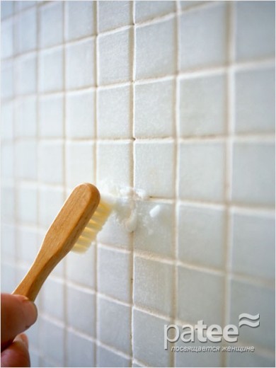 Сделайте жидкий раствор из пищевой соды и воды, который надо наносить на стены щеткой не боясь поцарапать кафель. Подождите три минуты, пока раствор впитается, после чего сполосните его водой.