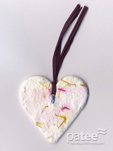 Такую игрушку-медальон можно смастерить из бумаги ручной работы или полимерной глины, добавив туда засушенные лепестки цветов.