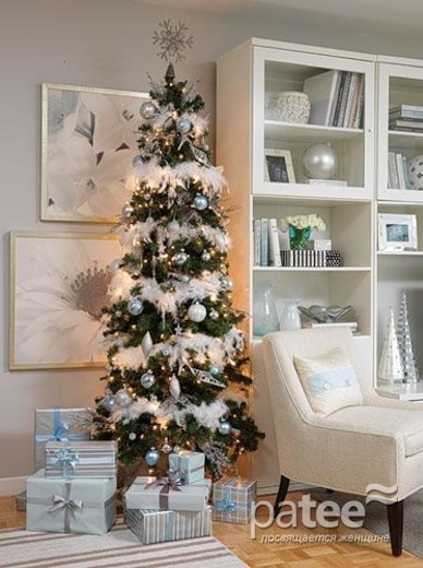 Очень эффектно смотрятся на ветвях серебристые блики, созданные с помощью специальных спреев или обычного лака с блестками, который найдется у каждой хозяйки дома. Сбрызните ли вы елочку полностью или создадите причудливые узоры на колючем полотне - все ограничивается лишь вашей фантазией.