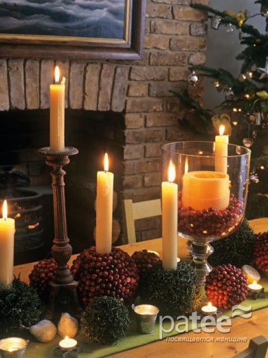 создайте старосветский стол, используя длинные свечи в стеклянных подсвечниках или шарах, украшенных темными ягодами.