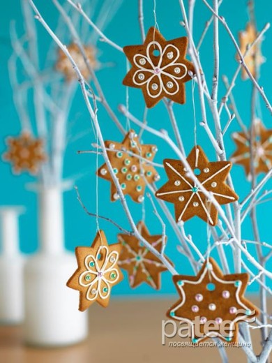 Испеките печенье в форме звездочек, покройте его цветной глазурью, сделайте небольшие отверстия для нитки и повесьте на ветки, предварительно обработав их золотой или серебряной аэрозольной краской.