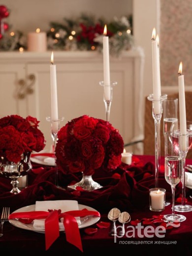 Выбрав бордовый цвет центральным для вашего праздничного стола, вы тем самым придадите ему некий шик! Используйте в композиции бордовые и красные розы.