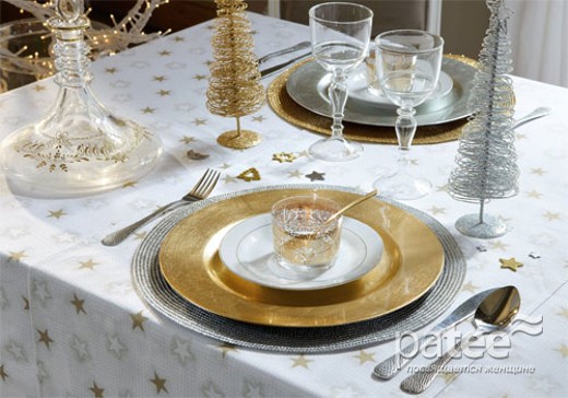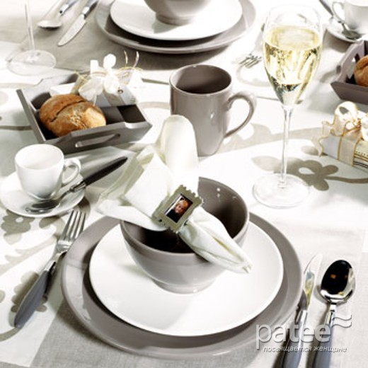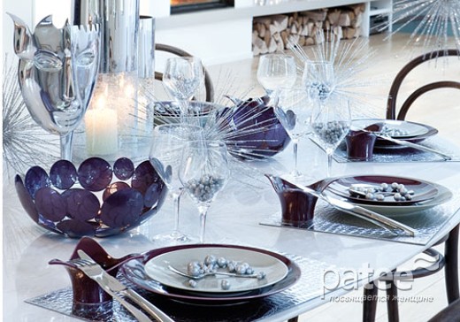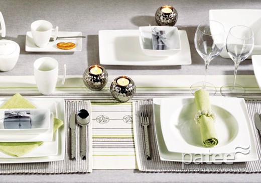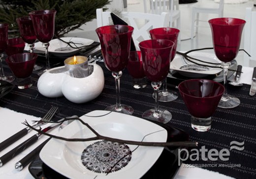 Сыграйте на контрасте цветов. На белую скатерть наложите узкую полоску черной ткани. Составьте ансамбль из черной и белой посуды, а бокалы выберите из приглушенного темного стекла.