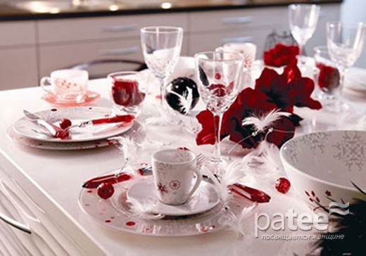 Обыграйте беспроигрышное сочетание белого и красного. Очень изящно смотрится на таком столе композиция из темно-красных цветов, которые можно заменить лепестками роз. А белые перья придают особенный шарм. Закрепите их на нитку, ленту или проволку, чтобы они не попадали в пищу.