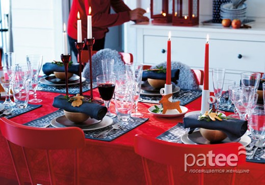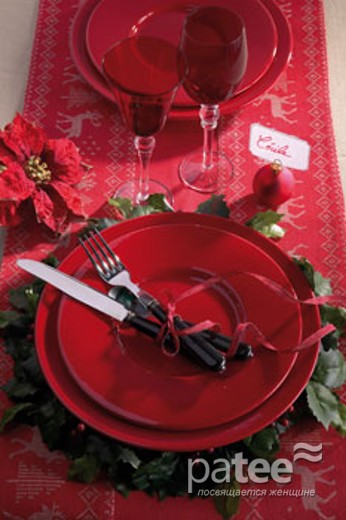 Ярко-красный цвет располагает к шумному ужину. Дополните красную скатерть салфетками сизого цвета с новогодним узором.