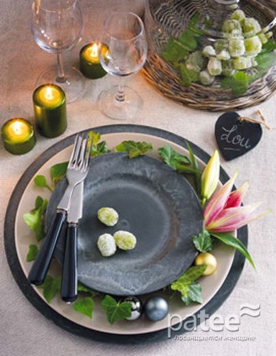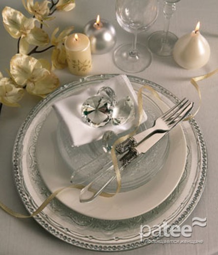 Если вы используете прозрачные тарелки, попробуйте оживить их с помощью ароматических свечей с жемчужным отливом.