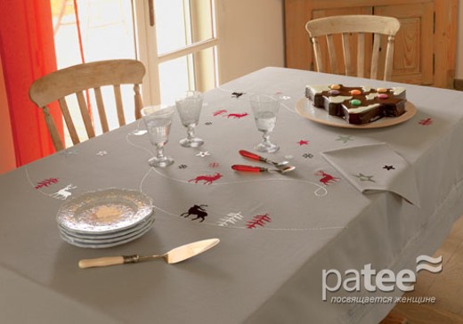 Сделать новогодним ваш обычный сервиз поможет праздничная скатерть с вышивкой.