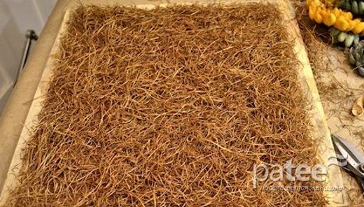 Подготовим холст – это может быть что угодно. В данном случае, это светло-коричневое полотно, напоминающее мох, которое можно найти в магазинах для рукоделия.