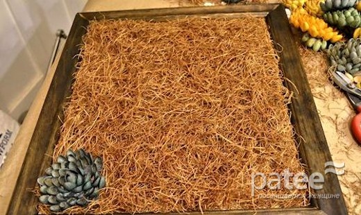 Поместим холст в рамку и начнем приклеивать цветы. Возможно, останется пустое пространство, и придется сделать еще несколько дополнительных цветочков.