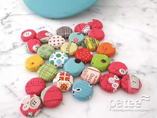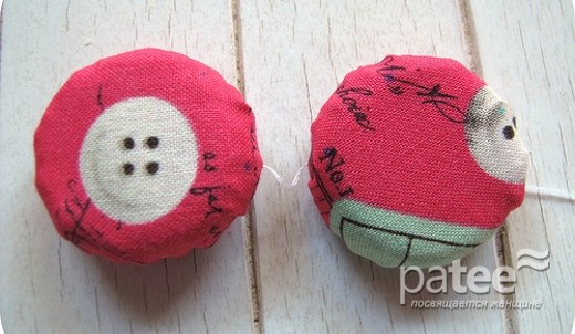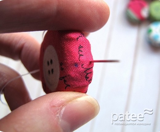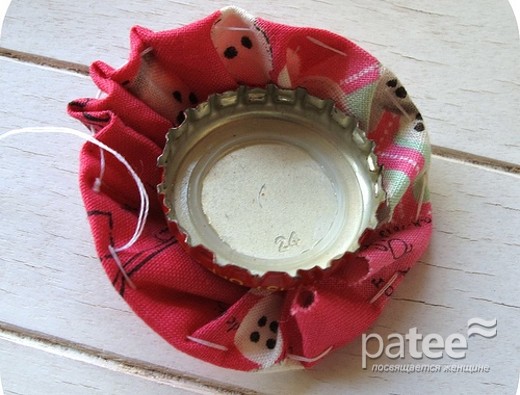 В иголку вставим двойную нить, сформируем из ткани своеобразный мешочек, как на рисунке, проденем по кругу нитку и как раз перед тем, как затянуть ее в узелок, вложим в ткань крышечку.