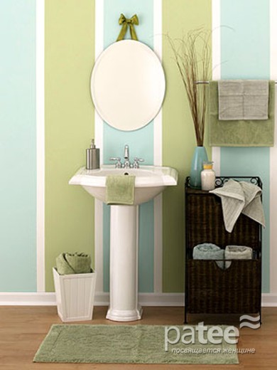 Кто сказал, что все цвета в ванной должен заменить одинокий белый цвет?Раковина, ванна, стены- как будто других цветов не бывает. Даже глаза устают от этой белой бесконечности. А вот если вы, наконец-то решились на смену декораций и хотите изменить цвет стен в ванной комнате, попробуйте использовать полосы. Помните, что горизонтальные полосы расширяют тесное пространство, а вертикальные – делают выше потолок.