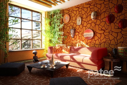 В цветовой гамме африканского интерьера предпочтения должны отдаваться цветам земли и солнца, т.е. сочетанию оттенков желтого с коричневым или черным. При выборе обоев, ковров, штор следует ориентироваться на геометрический рисунок, что свойственно африканскому народному этносу. Если есть возможность привезти из самой Африки ритуальную маску или, например, предметы утвари, то такие вещи идеально впишутся в создаваемый интерьер.