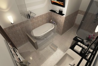 Если потолок ванной вам кажется слишком низким, его можно зрительно “отодвинуть” при помощи вертикальных полос. Яркие крупные рисунки на стенах ванной, наоборот, зрительно понизят потолок.