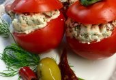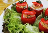 Помидоры, фаршированные крабовыми палочками, кукурузой, огурцом и сыром. Блюдо простое, но вкусное и праздничное, потому что эффектно смотрится на столе.