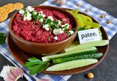 Очень простая в приготовлении, но вкусная и оригинальная закуска - это свекольный хумус. Вообще основным ингредиентом хумуса является нут, а так же в состав входят оливковое масло, чеснок, сок лимона, паприка, кунжутная паста.