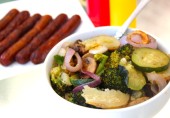 Легкая летняя закуска из печеных грибов с кабачком, луком, картофелем и брокколи.