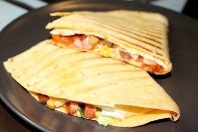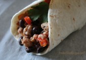 Кукурузные лепешки с начинкой из фарша индейки, черной фасоли, красного перца, помидоров и кинзы.