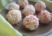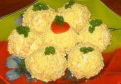 Шарики из сырной массы с майонезом и чесноком, с начинкой из зеленых оливок с грецкими орехами, покрытые тертыми крабовыми палочками.