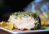 Шарики из острого чеддера со сливочным сыром и соевым соусом, покрытые тыквенными семечками.