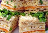 Закусочный торт "Наполеон" Ингредиенты: - готовые или выпеченные слоеные коржи (5 шт), - пачка майонеза, - рыбная консерва, - 4 яйца, - 20 г твердого сыра, - 1 крупная луковица, - 2 моркови