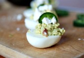Яичные белки с начинкой из желтков с авокадо, помидором, соком лайма и специями, посыпанные крошеным сыром и украшенные ломтиками перца халапеньо.
