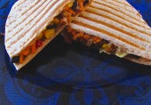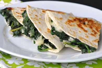 Кесадилья из пшеничных лепешек с вегетарианской начинкой: шпинатом, грибами, луком и чесноком, обжаренными на оливковом масле и посыпанными тертым сыром.