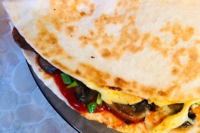Кесадилья из пшеничных лепешек с помидорами, кукурузой, тертым сыром и базиликом, обжаренная на сковороде.
