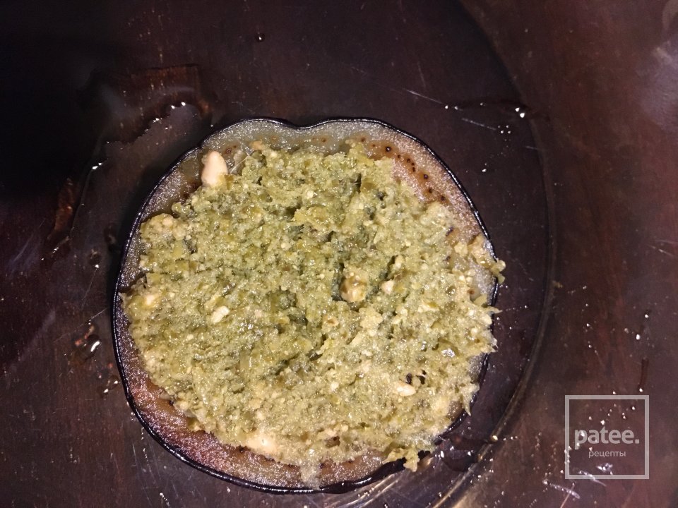 Баклажаны обжариваема на большом огне, смазываем слоем соуса песто.