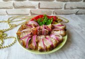 Сегодня готовлю свиную грудинку не совсем обычным способом. Рецепт когда-то нашла в интернете и с тех пор он прижился у меня на кухне. Грудинка получается с запахом печеного лука, вкусная и мягкая. Подойдет для ассорти на мясную тарелку к праздничному столу и на повседневном будет кстати.