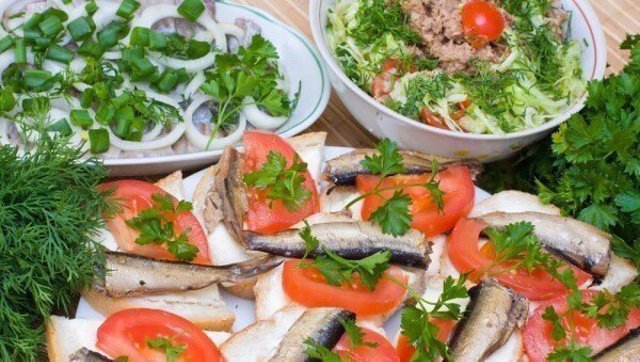 Чеснок пропустить через пресс, смешать со сметаной и майонезом. Добавить соль перец. Со шпрот слить масло. Багет нарезать и обжарить на масле до золотистой корочки. Смазать каждый кусочек чесночным соусом,сверху положить шпрот, кружочек огурца и пол кружочка помидоры. Прсыпать укропом
