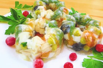 Заливное из курицы, красивое и вкусное праздничное блюдо, с маслинами и сладким зеленым горошком, обязательно украсит Ваш праздничный стол и порадует близких и гостей.