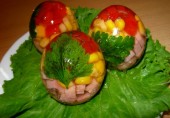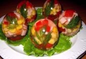 Ингредиенты на 10 порций:10 скорлупок от яиц2 стакана мясного соленого бульона20 г желатина1 свежий перец1 маленькая банка кукурузы300 г ветчинызеленьМожно использовать любой наполнитель: рыбу, курицу, мясо.
