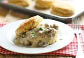 Вкусное печенье с остро-сладким сливочным соусом из обжаренной колбасы, лука, кайенского перца, сливок и кленового сиропа.