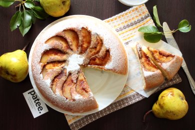 Бисквит с грушами получается влажным, воздушным и нежным от сока, который выделяют фрукты во время выпечки.