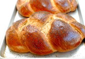 Сладкий еврейский хлеб хала в виде косички, посыпанный маком. Можно добавить в тесто изюм, а цельнозерновую муку заменить белой пшеничной.