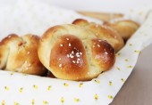 Еврейский хлеб хала из дрожжевого теста, связанного в узелки, посыпанный крупной солью и кунжутом.