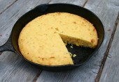 Хлеб из кукурузной муки с тертым чеддером, зернами кукурузы и зеленым луком, испеченный в духовке в чугунной сковороде.