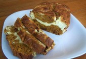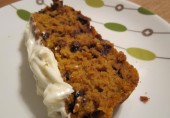 Сладкий хлеб из смеси для морковного торта с тыквенным пюре и шоколадом, покрытый сливочным кремом.