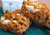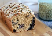Хлеб из овсяных хлопьев со свежей черникой и миндалем, покрытый сладкой глазурью из белого шоколада с кокосовым маслом.