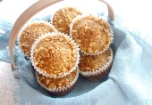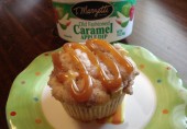 Мини-кексы с яблоками и специями, посыпанные топпингом из овсяных хлопьев с сахаром и корицей и украшенные карамельным соусом (или растопленной карамелью).