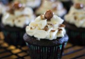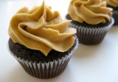Мини-кексы с темным шоколадом, покрытые сливочно-ванильным кремом с арахисовым маслом.
