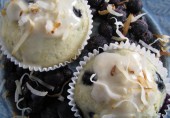Мини-кексы из цельнозерновой муки с кокосовым молоком, кокосовым маслом, кокосовой стружкой и черникой.