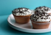 Шоколадно-кофейные мини-кексы, украшенные сливочным кремом с ванилином и эспрессо.